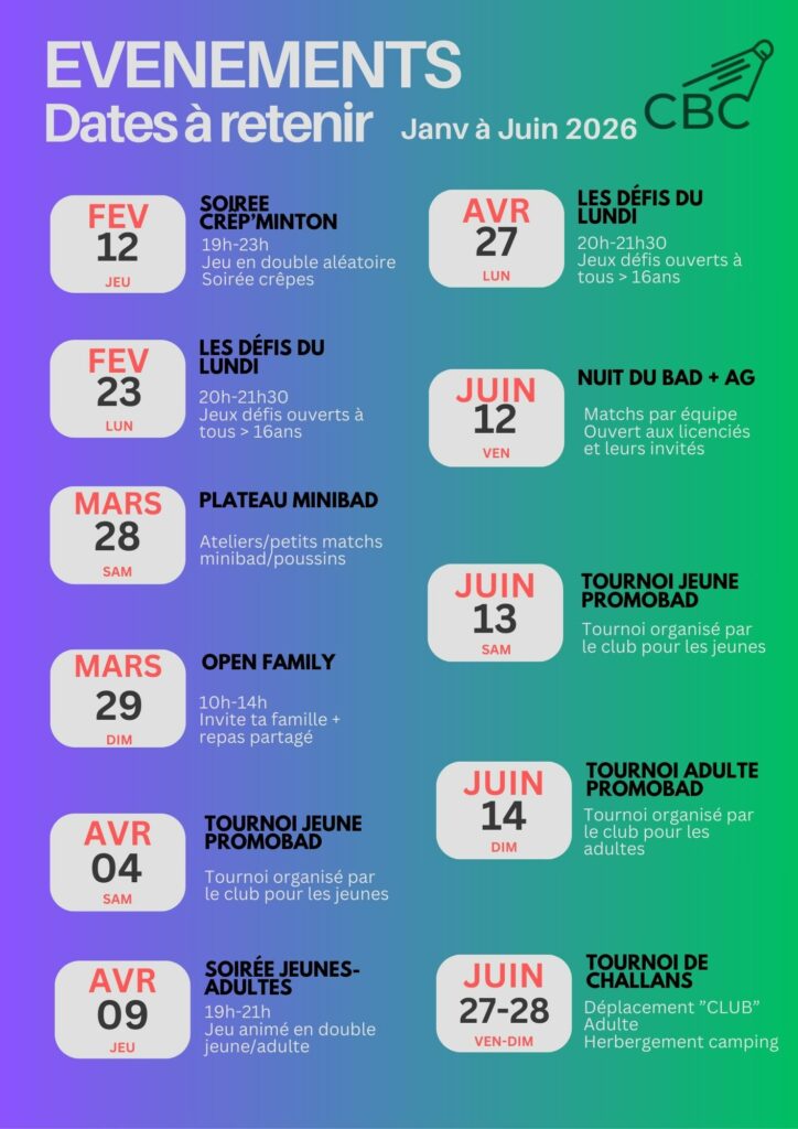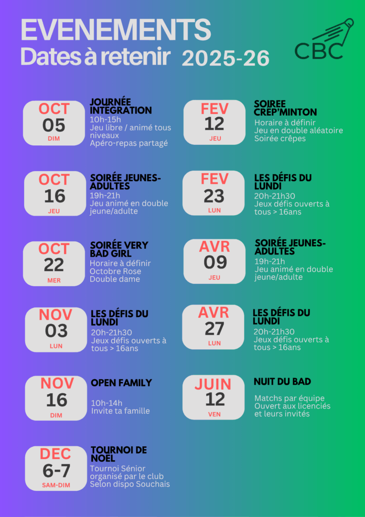 Rencontres interclubs, évènements Club, indisponiblités des salles, etc.